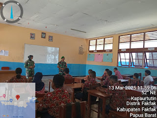 PABAR.EXPOST.CO.ID., FAKFAK - Babinsa Koramil 1803-01/fakfak Serma Ramli Dan Serda Kowad Siti Malak melaksanakan kegiatan Anjangsana Melalui Kegiatan Komunikasi Sosial ( Komsos ) Dengan Siswa/Siswi SMP Kelas IX , Bertujuan Memberikan Motisifasi Dan Semangat Agar Rajin Belajar Dan Selalu Jaga Kesehatan, yg bertempat di Ruang kelas SMP PGRI Kapartutin Distrik Pariwari. Kamis, (13/3/2025)